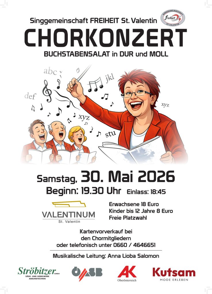 Chorkonzert – Motto: Buchstabensalat in Dur und Moll — Unter der Leitung von Anna Lioba Salomon wird das neue Konzertprojekt „Buchstabensalat“ präsentiert. Das Programm verspricht eine bunte Mischung aus deutschen und internationalen Hits, Pop-Songs, Evergreens und vielem mehr – quer durch alle Genres – alles in einer überraschenden Reihenfolge von A bis Z präsentiert. Lassen Sie sich von einem abwechslungsreichen Abend mit stimmungsvoller Klavierbegleitung und Instrumentalsounds verzaubern.